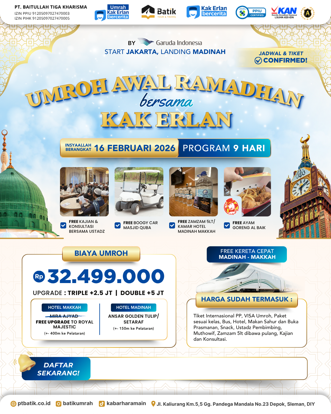 Umroh Awal Ramadhan 16 Februari 2026 (9 Hari) FREE Kereta Cepat